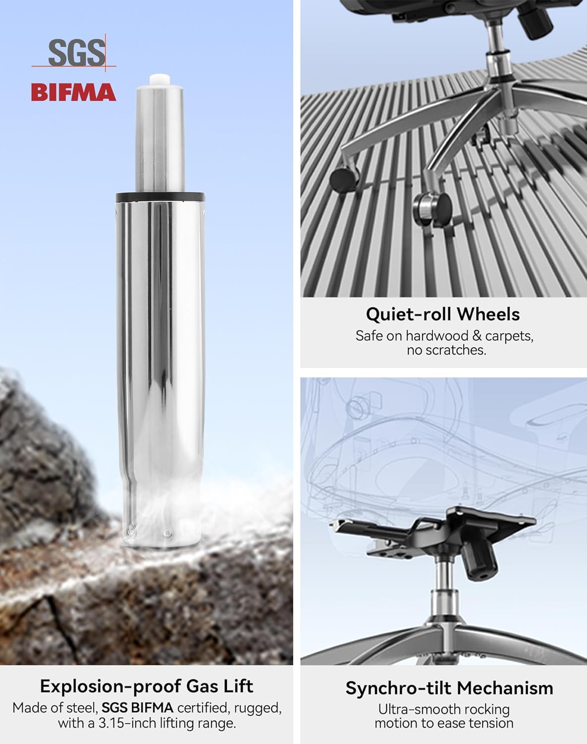 – **Robust Construction:** Passed BIFMA and a 1136kg static pressure test, supporting up to 330 pounds.